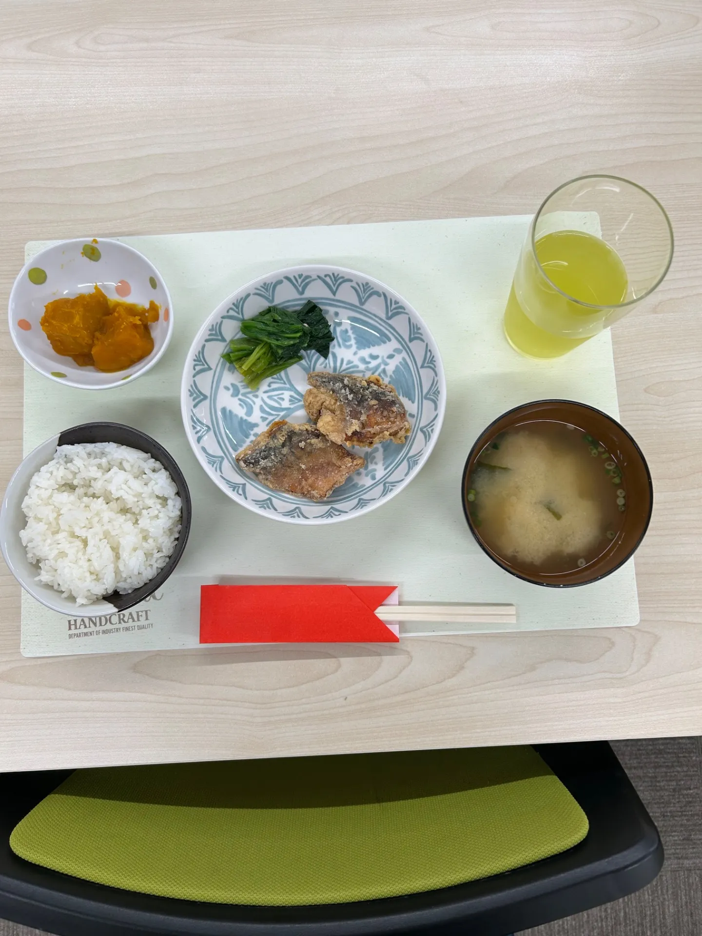 外はカリッと香ばしく、中はふっくらジューシー。かぼちゃの煮物や小松菜のおひたし、お味噌汁もついた栄養バランスの良い定食です。